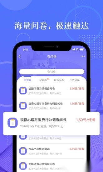 这是一个有酬问卷调查平台,人人都能兼职做问卷赚现金红包。平台上有海量问卷,能实现极速触达,调研报告可一站式接收,还有众多有趣的活动邀您参与。