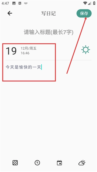 4、在“写日记”界面,输入标题(最长7字)及内容后,点击右上角【保存】按钮,完成本次日记的记录与存储。