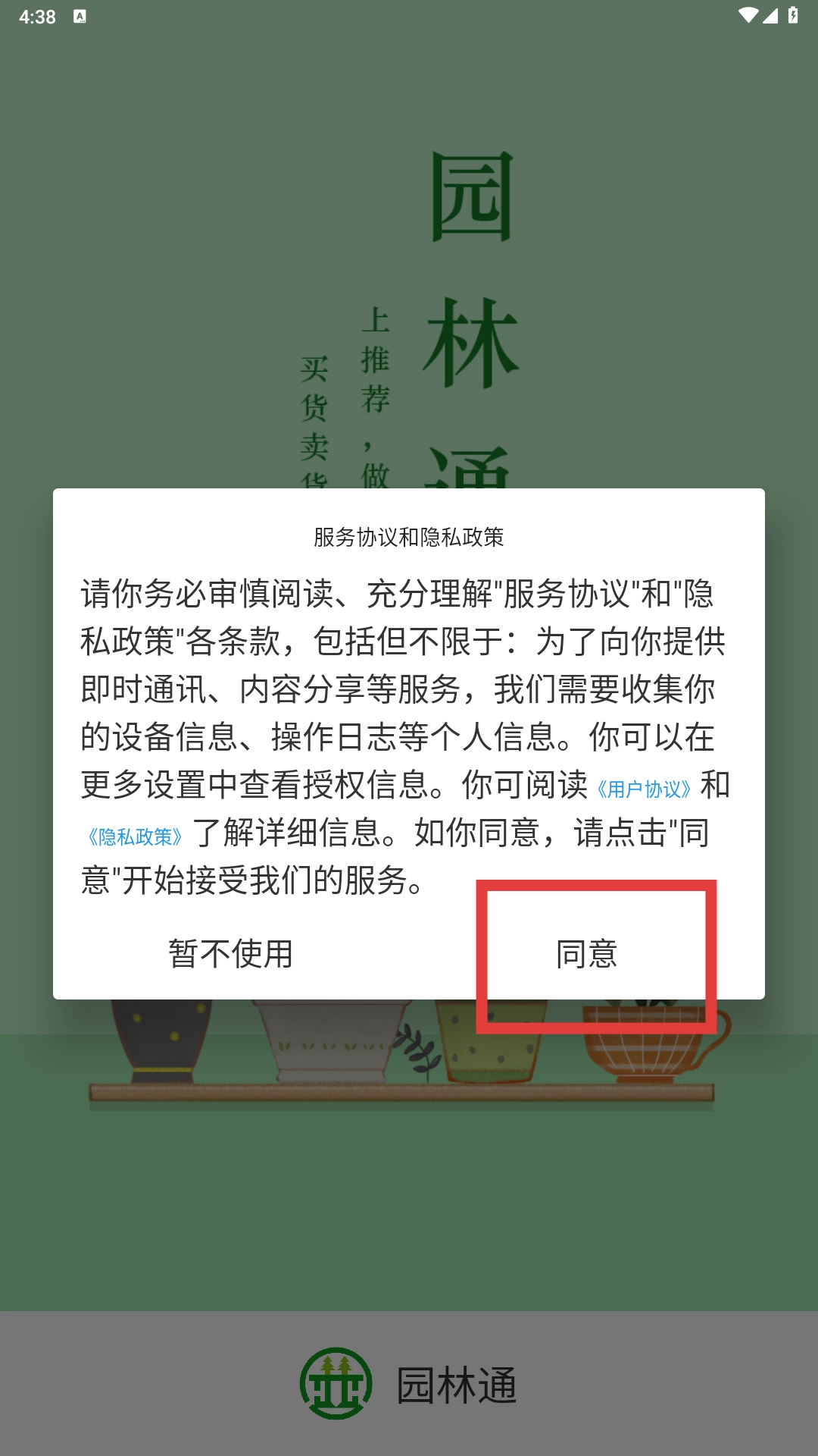 1、阅读【服务协议和隐私政策-弹窗内容】后,点击【同意-按钮】进入应用。