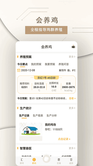 基础的生产信息:点击【会养鸡】里的【生产信息】 生产报表:点击【会养鸡】后选择【生产报表】