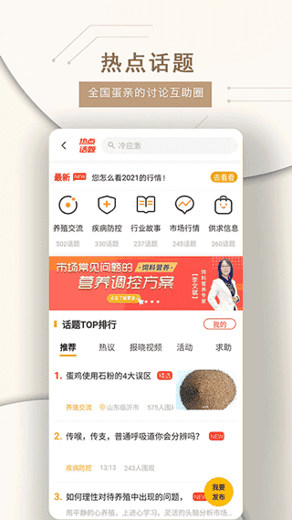 智慧蛋鸡是一款专注于蛋鸡养殖领域的服务平台,它能帮助用户及时掌握前沿的养殖策略与行业动态,获取最新的技术成果,学习更科学的管理模式,同时还提供雏鸡交易、兽药疫苗及饲料订购等实用服务,有需求的朋友欢迎了解使用。