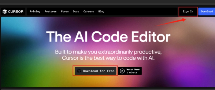 Cursor是一款功能非常强大的ai代码编辑器,不过目前没有安卓和苹果客户端,点击进入提供的地址后可以使用windows版和mac版,使用前需要注册账号,支持google和github账号登录,Cursor供提供了Ask、Edit、Agent三种交互模式,大家可以自己根据需求来选择代码问答设计模式或其他模式。