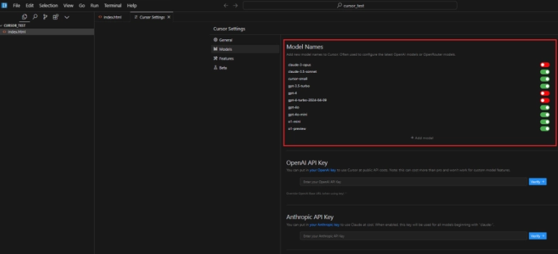 4.Cursor了多种LLMs,包括GPT4s、Claude3.5s以及OpenAI的o1-preview和o1-mini推理模型。在右上角的设置中可以开启这些模型辅助编程。