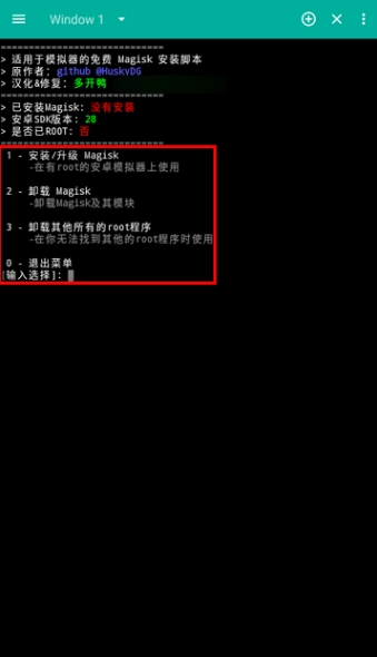 3. 进入面具鸭,输入“m”开始安装Magisk。