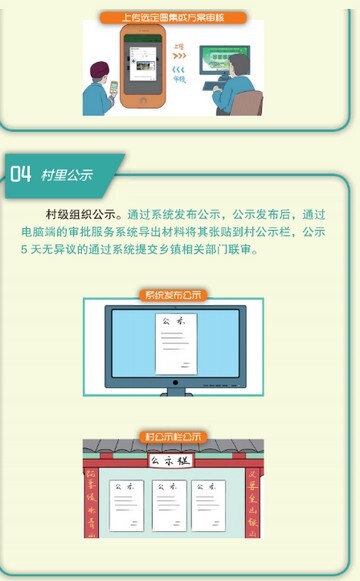 村级组织公示流程如下:先通过系统发布公示内容,公示发布后,工作人员需从电脑端的审批服务系统导出相关材料,并将其张贴至村公示栏;若公示满5天且未收到异议,再通过该系统提交至乡镇相关部门进行联合审核。
