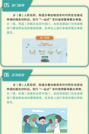 乡(镇)人民政府、街道办事处在接收农村村民住宅建设申请的相关材料后,推行“一站式”农村建房联审联办审查机制。乡(镇、街道)下辖的农业农村部门、自然资源部门以及住建等部门,要依据各自的管理职责,通过系统开展审查工作并出具审批意见。