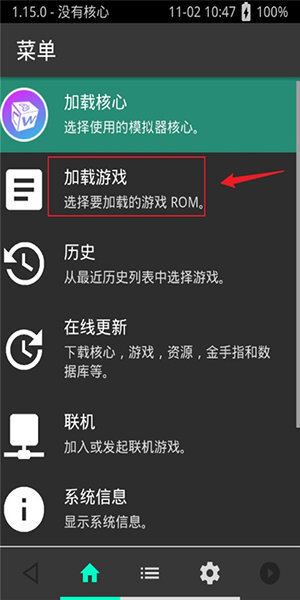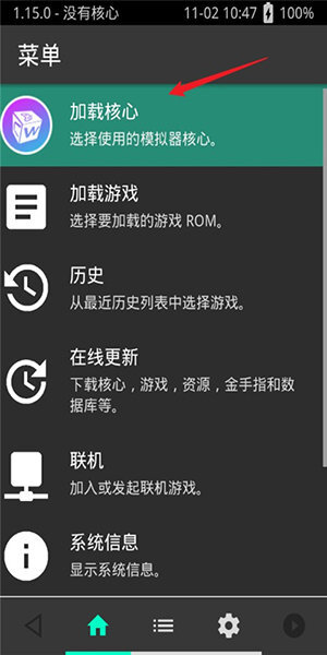 1、加载核心:选择、并安装模拟器核心。