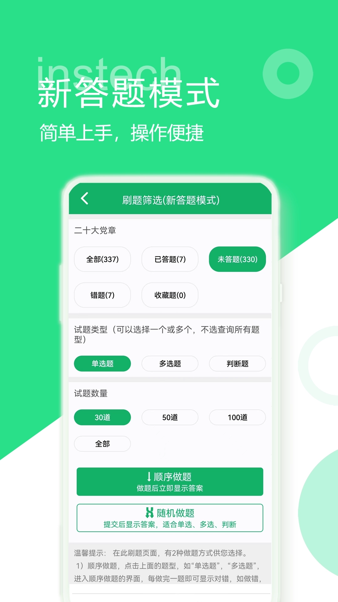 二十大题库是一款学习资源丰富的平台,在刷题前可以任意的选择题型、题目数量,还可以选择顺序做题或随机做题,而且可以将易错的题目一键进行收藏,方便随时巩固,软件还设有轻松搜题的功能,可以获取题目的答案及解析。