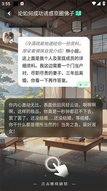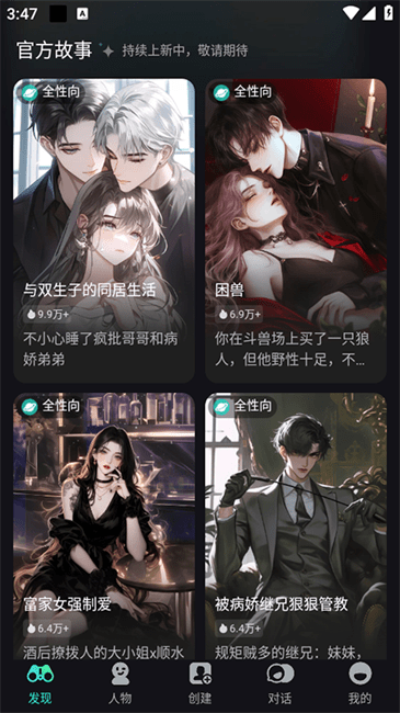 互动故事沉浸体验:涵盖恋爱、悬疑、大女主、abo、疯批、吸血鬼、玄幻等多元题材剧情,用户能深度融入故事世界,借助对话选项的抉择来推动情节的走向与发展。