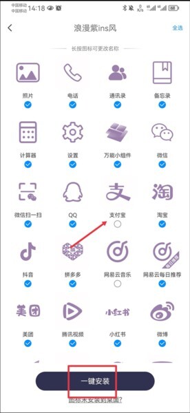 3、接着点击一键安装就可以了,要是有图标不想替换,把对应的勾选取消掉就行。