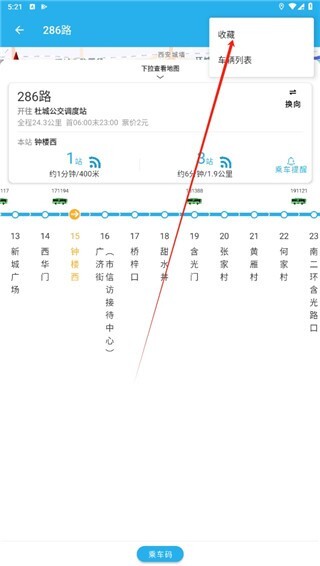 3、点击右上角的三个点图标,接着选择收藏选项,把常用的公交车线路收藏起来