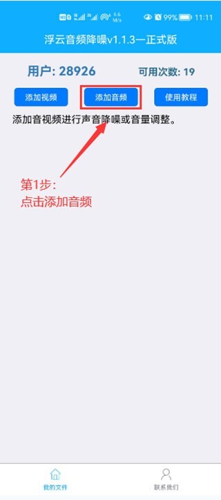 1、启动浮云音频降噪软件,点击添加音频的按钮,完成音频的选择操作;