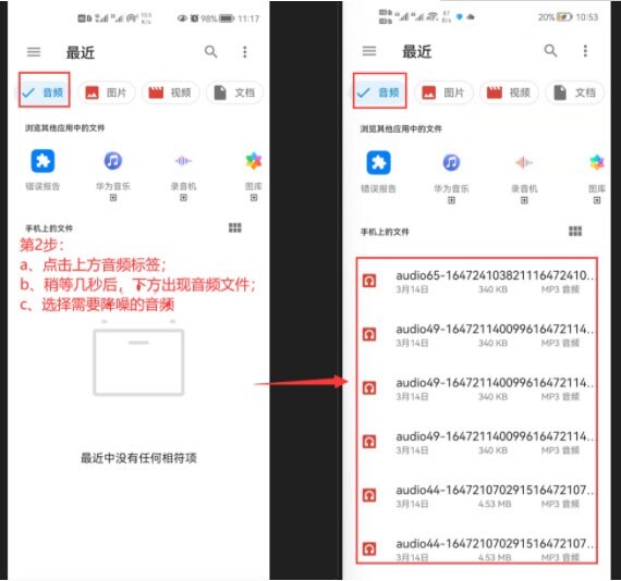 2、点击顶部的“音频”标签,等待数秒后,系统会自动检索手机内的音频文件。此时下方将显示出音频文件,具体可参考下图右侧部分。