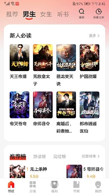2、进入书城界面后,能看到推荐、男生、女生、听书等不同分类板块,大家可以根据自己的兴趣选择对应的分类。
