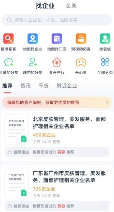拥有1.6亿+企业信息、2.4亿+店铺信息与3.5亿+人脉资源,还有100万+上下游企业名录;搭配50+维度筛选条件、地图找企业/门店功能及短视频拓客工具,助力轻松获客!老板手机号一键获取,支持直接打电话、加好友,高效促成开单!