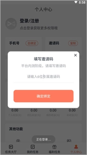 3、完成填入操作后就能登录成功,接着用户只需邀请一位好友完成任务,就可以赚取红包了。