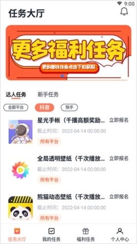 「任务大厅」每天都会推出不同的任务,帮助达人在短视频平台发布自己的作品。