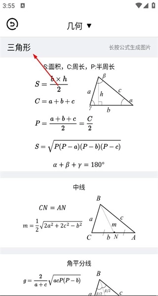 2、打开几何页面,查看三角形的面积、周长等公式,并浏览这些与几何相关的公式内容信息。