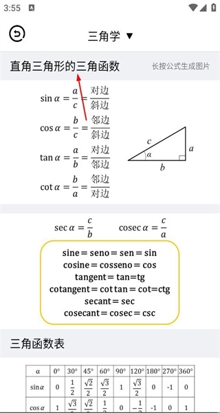 4、点击三角学按钮,进入三角学页面后,查看直角三角形三角函数等相关的公式内容。