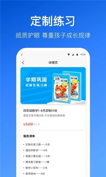 线上线下教材相结合,既夯实了学校的教学基础,又培养了孩子自主学习的习惯;借助大数据精准定位孩子的学习薄弱点,进而为其定制针对性练习,助力解决学习难题。
