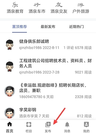 2、进入酒泉在线后,在首页底部能看到一个【发布】按钮,点击它即可。