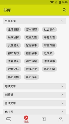 2、以豆瓣阅读为例,能看到悬疑、侦探、科幻等分类。