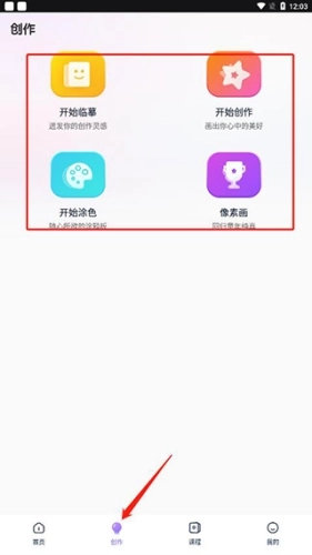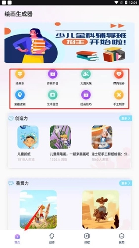 1、打开盗梦师软件,相较于其他同类软件,它的功能更为丰富多样。在首页界面,你能看到绘画本、传统节日主题内容、艺术鉴赏板块,此外还有关于创造力、鉴赏力培养的教育视频等资源。