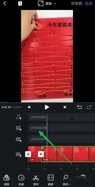 4、点击【字幕】,可以选择字幕样式并输入内容,点击【√】符号即可,还可以设置音乐及其他特效;