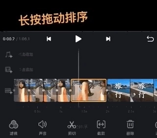 2、长按视频片段,就能前后拖动素材进行排序,很符合直觉的设计。