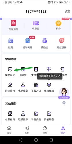 打开跨越速运并登录,随后进入【我的】页面,点击其中的【实名认证】选项。