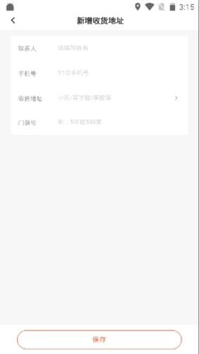 4、进入新增收货地址页面,填写联系人、手机号码、收货地址及门牌号信息后,点击【保存】按钮。