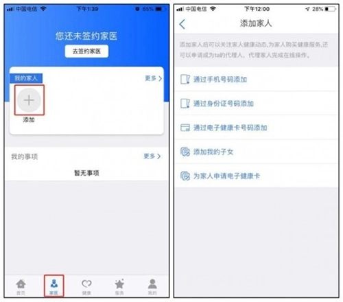 (1)在首页底部找到“家医”选项并点击,进入家医页面后,找到“我的家人”模块,点击其中的“+”按钮,即可进入添加家人的页面。添加家人的方式包括:搜索家人的手机号码、搜索身份证号码、搜索电子健康卡号码、直接添加我的子女,以及为家人开通电子健康卡。