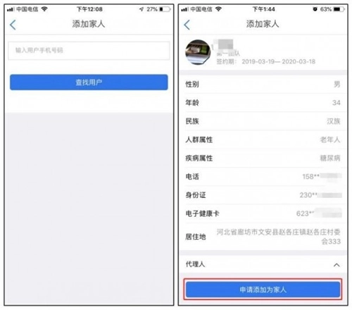 (2)若拟添加的家人已在健康廊坊完成注册,可通过搜索其手机号码、身份证号码或电子健康卡号码来添加该家人。