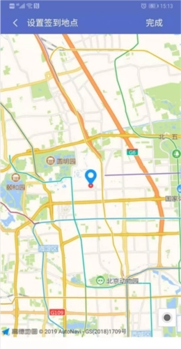 3、在签到页面可以选择开启“定位位置”功能,进入签到地点设置页面后,完成签到地点的设置,点击“完成”按钮即可返回签到界面。