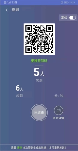 2、页面展示签到二维码,同时呈现实到人数、应到人数、签到时间、签到定位及签到详情等信息