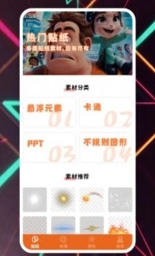 1、平台主要设置了贴纸、表情包及壁纸三大板块。