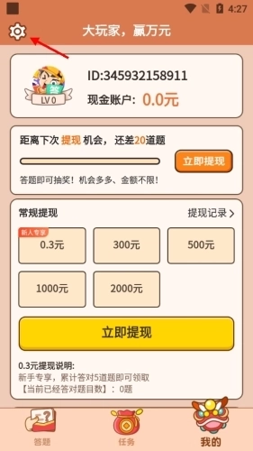 2、提现的前提是新手用户需答对五题,老用户则要达到上方的答题次数后才能提现。