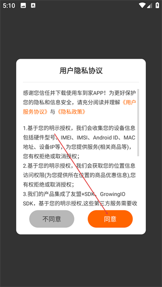 1、打开车到家应用后,仔细阅读《用户隐私协议》,了解其中关于【设备信息】【位置信息】等权限的授权说明,随后点击【同意】按钮即可进入应用。
