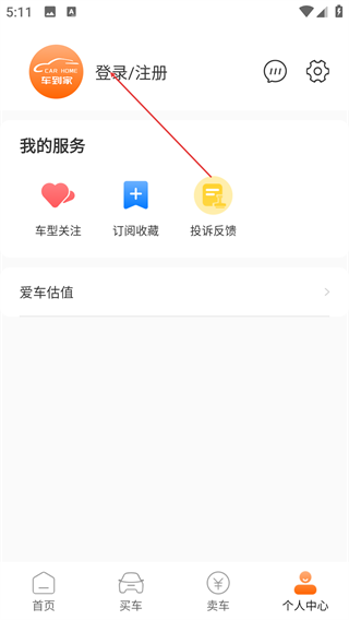 在页面中,您可以使用【车型关注】-【订阅收藏】等服务,也能操作【爱车估值】功能,点击顶部的【登录/注册】按钮即可进入登录流程。