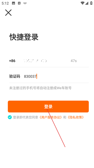 4、进入【快捷登录】界面后,填写手机号并输入【验证码】,勾选相关协议,随后点击【登录】按钮即可完成操作;若使用的是未注册过的手机号,系统会自动为其创建We车账号。