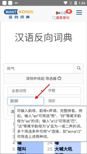 打开“筛选器”,在其中的韵脚区域输入韵母或声调