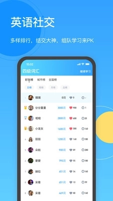 拥有全国、城市排行榜,让你轻松结交英语大神。同时支持好友榜单,快和你的好友一较高下吧!