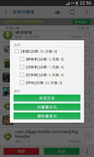 3.支持批量对APK安装包进行删除与安装操作,还能智能筛选出重复的安装包以及旧版本的安装包。