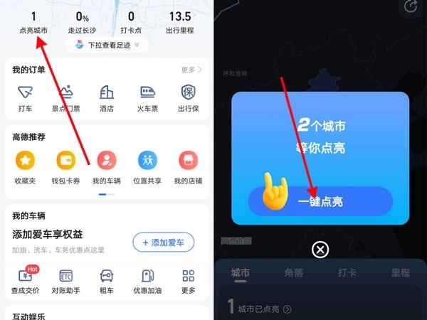 2、登录后找到“点亮城市”功能入口,点击“一键点亮”即可自动标记已到访过的城市。