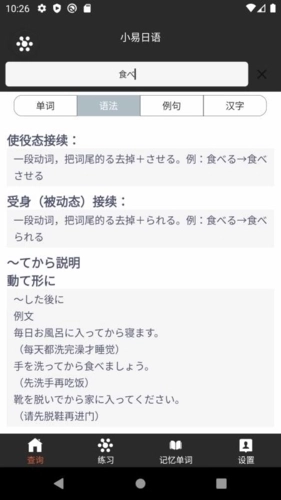 在动词词典的基础上新增了日语语法模块,会定期更新日语学习相关的各类内容,像语法、句型、单词和日本文化等方面。同时保留了日语动词及形容词词典的原有功能,收录了最全面的基本动词与复合动词,能提供详细的动词形态变化、释义以及丰富的例句,每个动词都配有详尽例句,还可以搜索常用的日语例句。