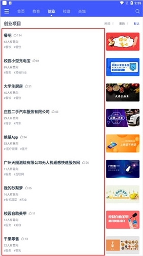 2、创业板块:在这里,你可以发布独具个人特色的创意项目,还能寻觅到志同道合的创业伙伴与天使投资人,助力你的校园创业之路稳步迈向成功。