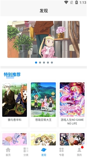 4、发现界面呈现特别推荐、猜你喜欢、新番原作抢先看、旧番补原作、动画化决定等栏目。