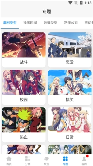 5、专题界面根据番剧类型、播出时间、改编类型、制作公司、声优等方面进行动漫查找操作。