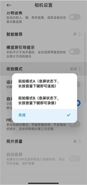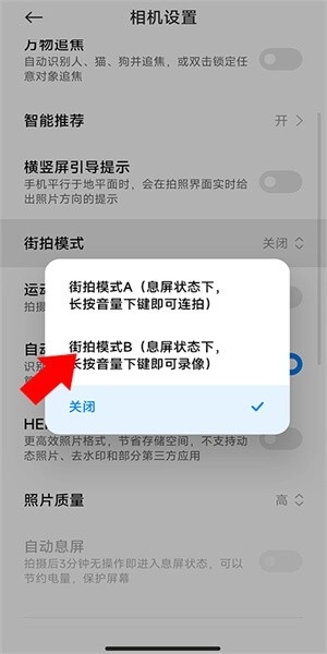5、找到街拍模式选项并选择【街拍模式B】,之后在息屏状态下长按音量减键,就能开始录制视频了。