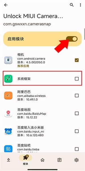 2、接着打开LSP/XP框架管理器,并激活模块(若模块激活后出现失效情况,可勾选系统框架,随后重启手机)
